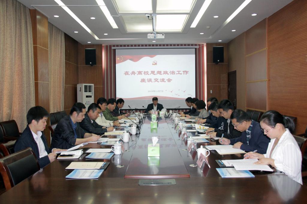 会上,舟山市教育局党委书记、局长祝幸安,浙江大学海洋学院宣传部部长王万成,浙江海洋大学党委委员、宣传部部长陈宏祖,我校党委委员、副校长孔志光,舟山群岛新区旅游与健康职业学院党委委员、副校长陈爱国,舟山职业技术学院(舟山技师学院)党委副书记苏启军结合各自高校的特点,分别交流了本单位思想政治工作的亮点及特色、思路和打算。