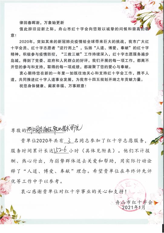 近日,舟山市红十字会专门向我校发来感谢信,感谢我校在过去一年中关心和支持,对我校参加红十字会组织的疫情防控志愿服务的3名教师表示充分肯定及崇高敬意。