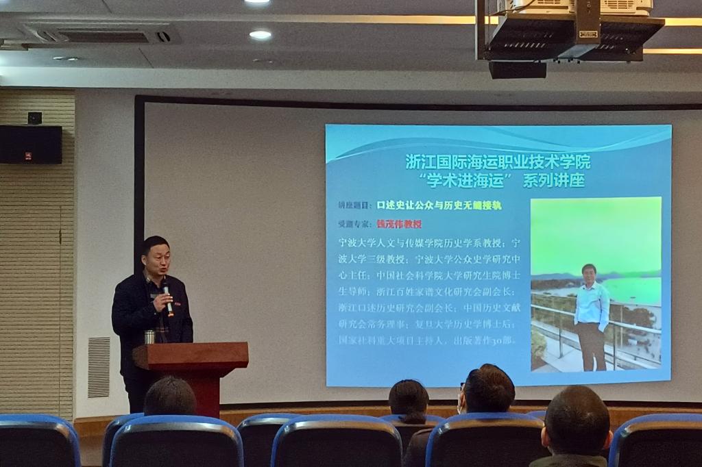 为了活跃校园文化,营造浓厚的学术氛围,培育科学精神,展示新时代大家风范。4月7日下午,学校“东海讲坛”在国际海员培训楼三楼报告厅首次开讲。宁波大学人文与传媒学院历史学系教授钱茂伟作了《口述史让公众与历史无缝接轨》专题讲座。校党委委员、副校长夏志刚主持讲座,学校舟山群岛文化研究中心、“蚂蚁岛精神”研究中心、人文社科研究中心全体成员和校内部分教师,浙江海洋大学和舟山博物馆专家、学者等共40余人参加了讲座并进行了研讨。