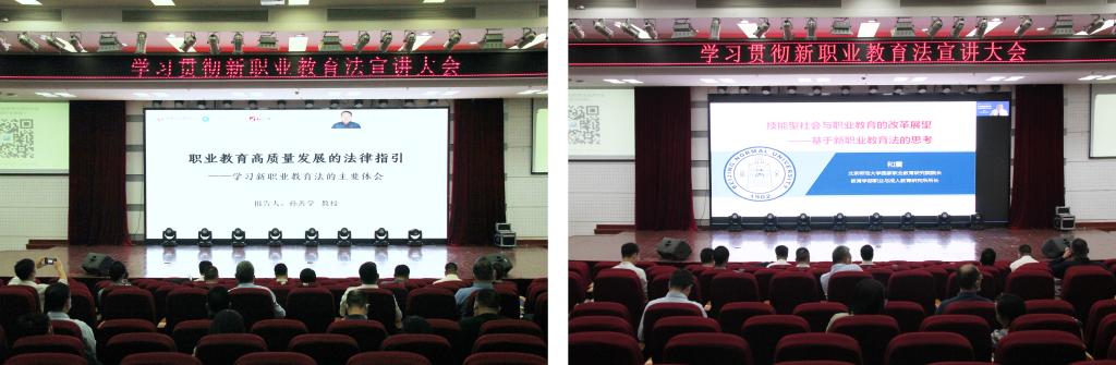 为深入贯彻落实全国职业教育大会精神,做好新职业教育普法工作,全面准确解读新职业教育法,持续推进依法治教、依法办学,扎实推动职业教育高质量发展,5月8日,中国高等教育学会以网络公益直播的形式举办“学习贯彻新职业教育法宣讲大会”,学校组织校领导、中层干部,岗位主管、专业(群)负责人,骨干教师等在图书馆四楼报告厅进行了聆听。