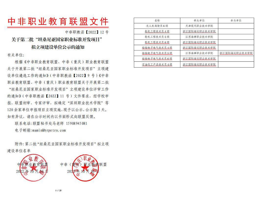 10月16日,中非职业教育联盟公布了《关于第二批“坦桑尼亚国家职业标准开发项目”拟立项建设单位》名单,我校6个项目成功入选。