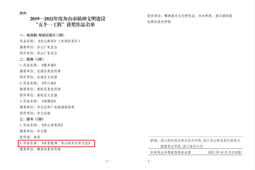 日前,舟山市委宣传部公布了2019-2022年度舟山市精神文明建设“五个一工程”获奖作品名单,我校群岛文化研究中心孙峰研究员参与创作的《井里乾坤:舟山的井与井文化》榜上有名,这也是我校首次荣获该奖项。