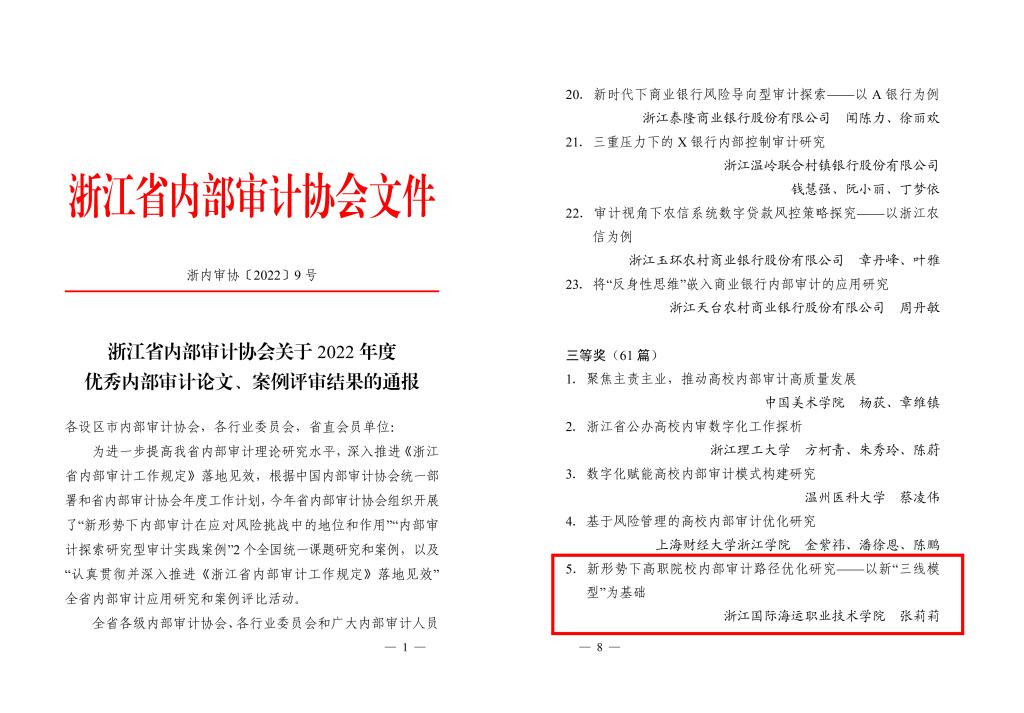 近日,浙江省内部审计协会公布了2022年度优秀内部审计论文、案例评审结果,我校审计处张莉莉同志撰写的论文《新形势下高职院校内部审计路径优化研究——以新“三线模型”为基础》荣获“新形势下内部审计在应对风险挑战中的地位和作用(全国统一课题)”论文评比三等奖、同时也获得了舟山市内部审计协会论文评比二等奖。