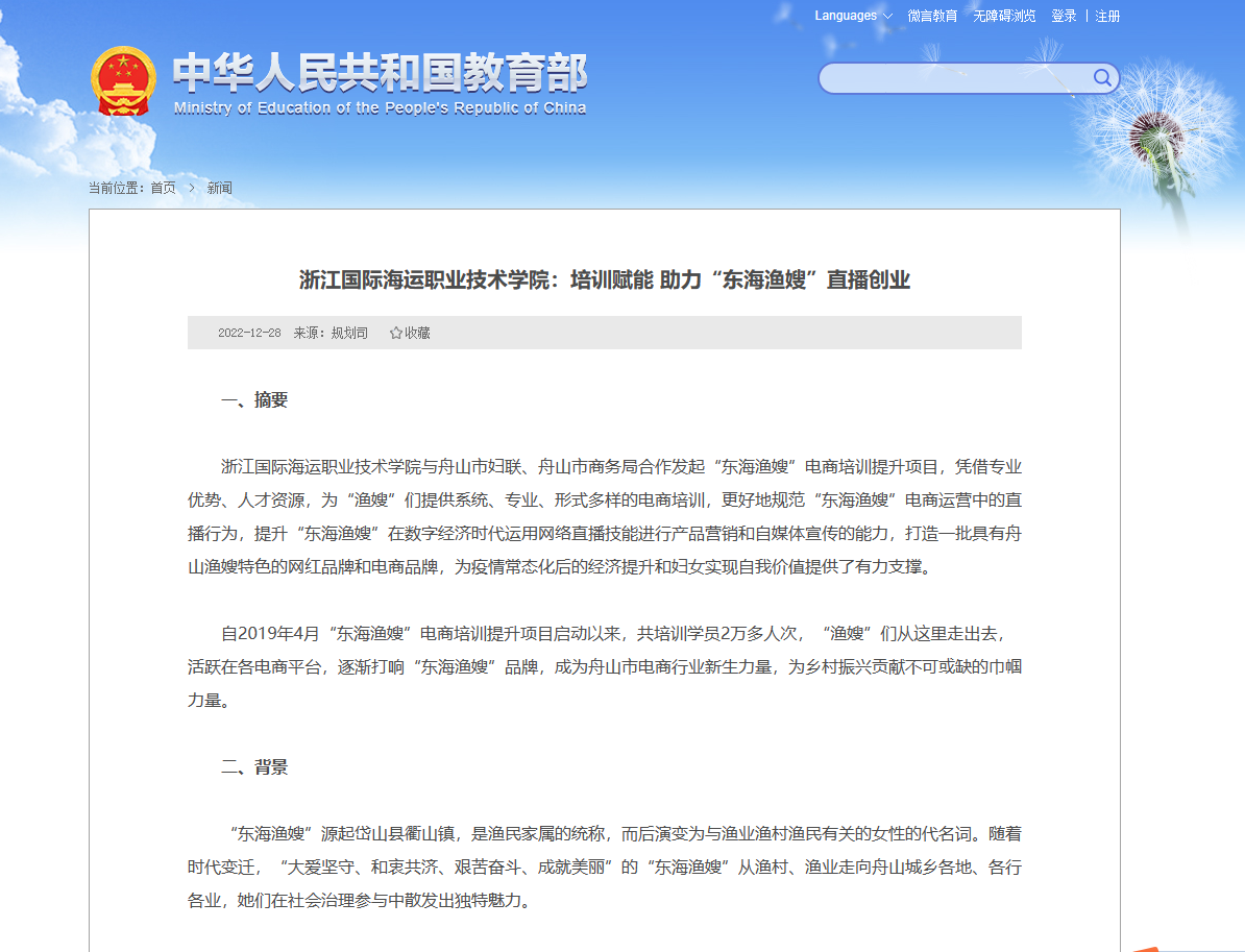 20194月,我校与舟山市妇联、舟山市商务局合作发起“东海渔嫂”电商培训提升项目,凭借专业优势、人才资源,为“渔嫂”们提供系统、专业、形式多样的电商培训,经过三年多线上线下培训赋能,培育产生了一批颇具名气的网红女主播,活跃在各电商平台,逐渐打响“东海渔嫂”品牌,成为舟山市电商行业新生力量,为乡村振兴贡献不可或缺的巾帼力量。(港口管理学院、舟山市乡村振兴学院)