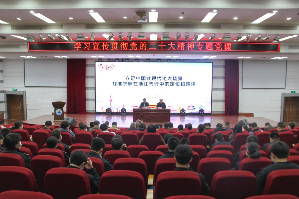 为深入学习宣传党的二十大精神,牢牢把握立德树人根本任务,加快建设海洋特色鲜明的高水平职业院校,3月8日,苏为泽书记在图书馆四楼报告厅作了题为《立足中国式现代化大场景 找准学校在浙江先行中的定位和路径》专题党课。校领导、全体中层干部和学生代表共150余人到场聆听。党课由党委副书记孔志光主持。