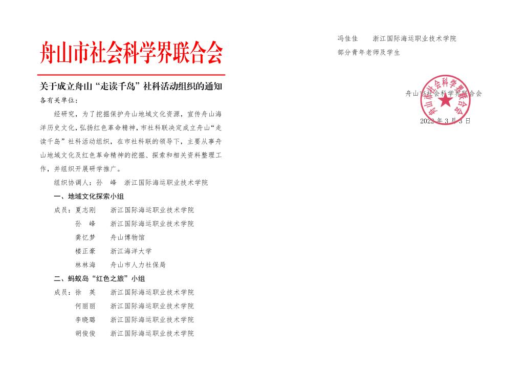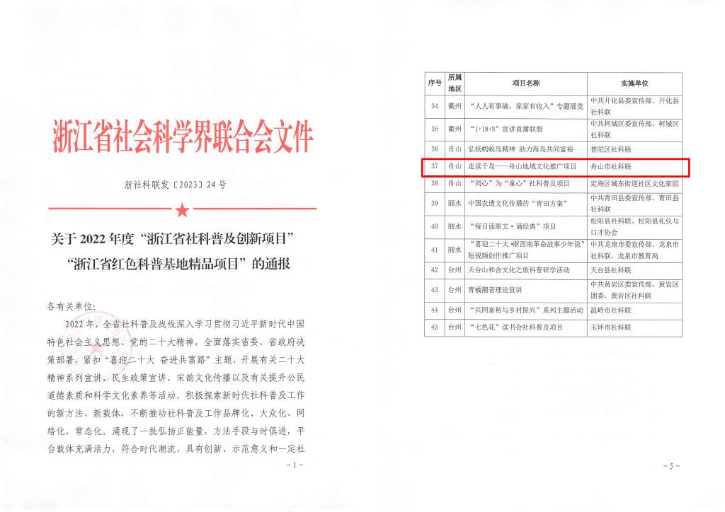 近日,由舟山市社科联组织、我校作为主要承担单位的“走读千岛——舟山地域文化推广项目”被浙江省社会科学界联合会公布为2022年度“浙江省社科普及创新项目”。