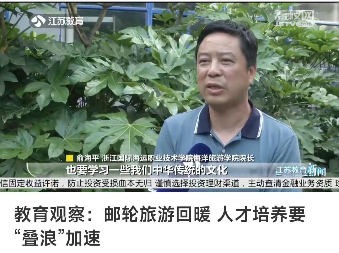 会上,10所专业院校的邮轮专业带头人共同分享了国际邮轮人才培养、专业建设和人才培养模式的经验,就邮轮行业和邮轮教学进行深入探讨交流。会上,俞海平院长作了《产教融合背景下邮轮乘务管理专业国际化发展策略》主题分享,围绕邮轮乘务管理专业国际化发展现状、我校国际邮轮乘务管理专业的发展实践道路等内容展开,阐述了我校邮轮乘务管理专业发展过程中产教融合的经验与成效,对高职院校国际邮轮乘务管理专业实训设施建设和教学实践起到示范和助推作用。会后,俞海平院长还接受了江苏教育电视台的采访。