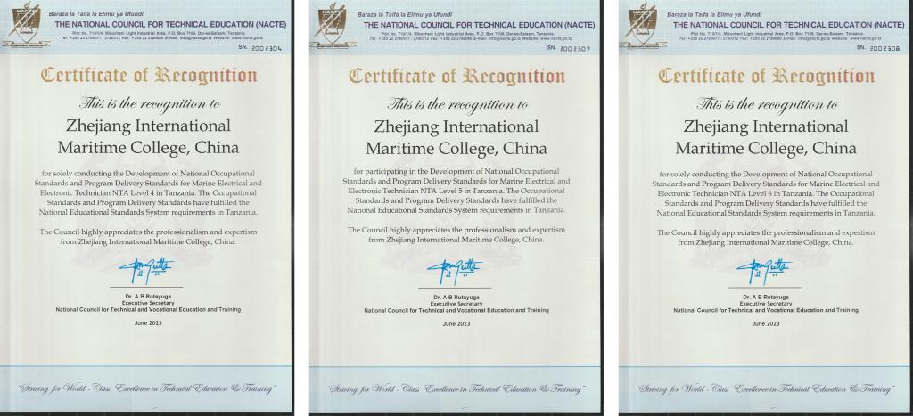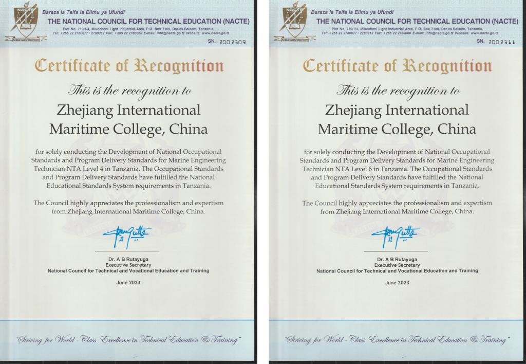 20236月,由我校主持、参与的坦桑尼亚职业标准和配套专业教学标准轮机工程技术员4级、轮机工程技术员6级、船舶电子电气技术员4级、船舶电子电气技术员5级、船舶电子电气员6级、石油化工产品技术员4级等6个项目获得坦桑尼亚国家教育委员会认证,正式纳入坦桑尼亚国家职业教育体系。
