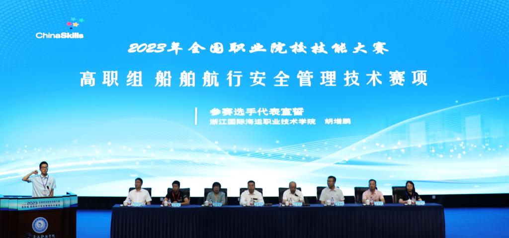 8月8日-10日,2023年全国职业院校技能大赛(高职组)船舶航行安全管理技术赛项在天津海运职业学院举行,来自全国26支代表队参加比赛,我校胡曾鹏同学作为参赛代表在开幕式上发言。由航海工程学院江建华、刘慧君、李永广、虞磊、杨其雷、李子强六位老师指导的2021级航海技术专业黄康、胡曾鹏、黄茵梅、刘京安等4名学生组成的浙江省代表队,荣获该赛项团体三等奖。