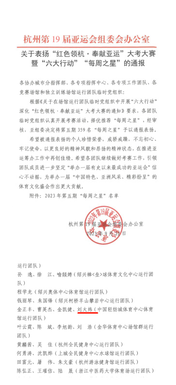 刘大炜老师是我校唯一一个被“杭州亚组委”抽调到赛区的工作人员。作为党员,他始终不忘初心,牢记使命,在半年多的时间里,按照“亚组委”场馆管理规范要求,对标对表,主动作为,敢于担当,时刻牢记“从哪里来,来干什么,留下什么”,从不怕吃苦,勇于奉献,圆满完成赛区工作。以良好的精神风貌和昂扬的精神状态,坚定“举办一届有史以来最成功的亚运会”信念不动摇,立志为举办一届“中国特色、亚洲风采,精彩纷呈”的体育文化盛会做出贡献,刘大炜老师凭借踏实的工作作风,荣获杭州亚组委“关于红色领杭 奉献亚运”大考大赛暨“六大行动”“每周之星”的通报表扬,为自己和学校争得了荣誉。(文化体育部)