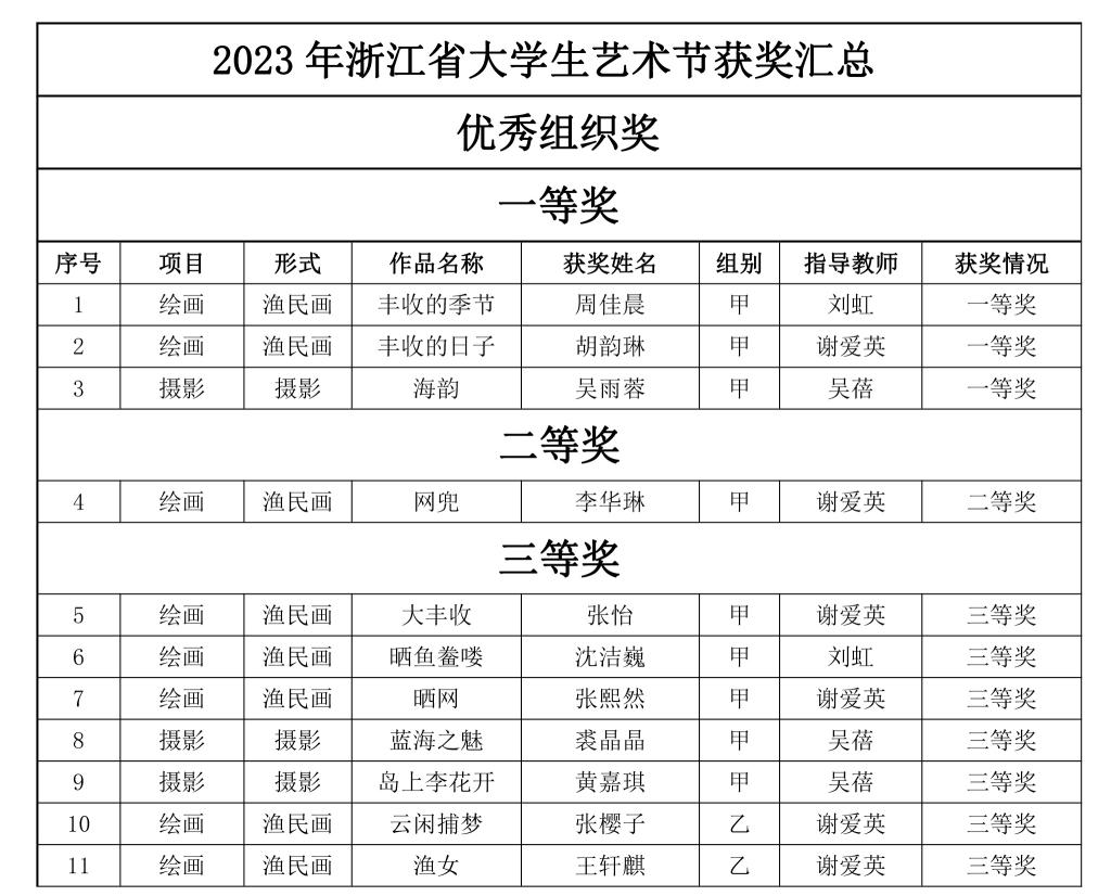 参赛选手以渔民画的形式描绘出了舟山的海岛特色,用相机捕捉到的校园周边的美景,体现了近年来我校美育教育的成果,这也是我校在省大学生艺术节中的一次重大突破!