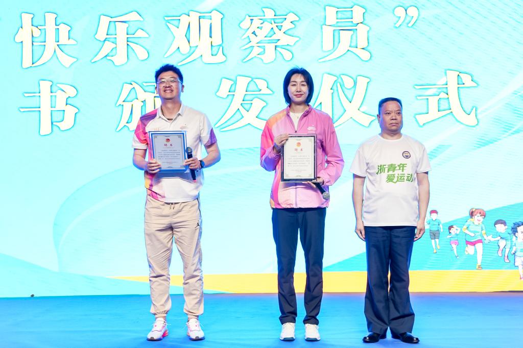 启动仪式现场,前国家女排队员、舟山市青少年体校副校长罗瑜和刘大炜老师分享了自己的运动成长经历。刘相主席向两位颁发“快乐观察员”聘书。