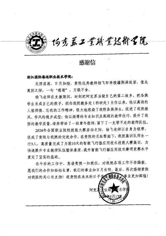 近日,学校收到了来自阿克苏工业职业技术学院专门发来的感谢信,感谢我校杨飞老师在阿克苏支教期间的努力付出。
