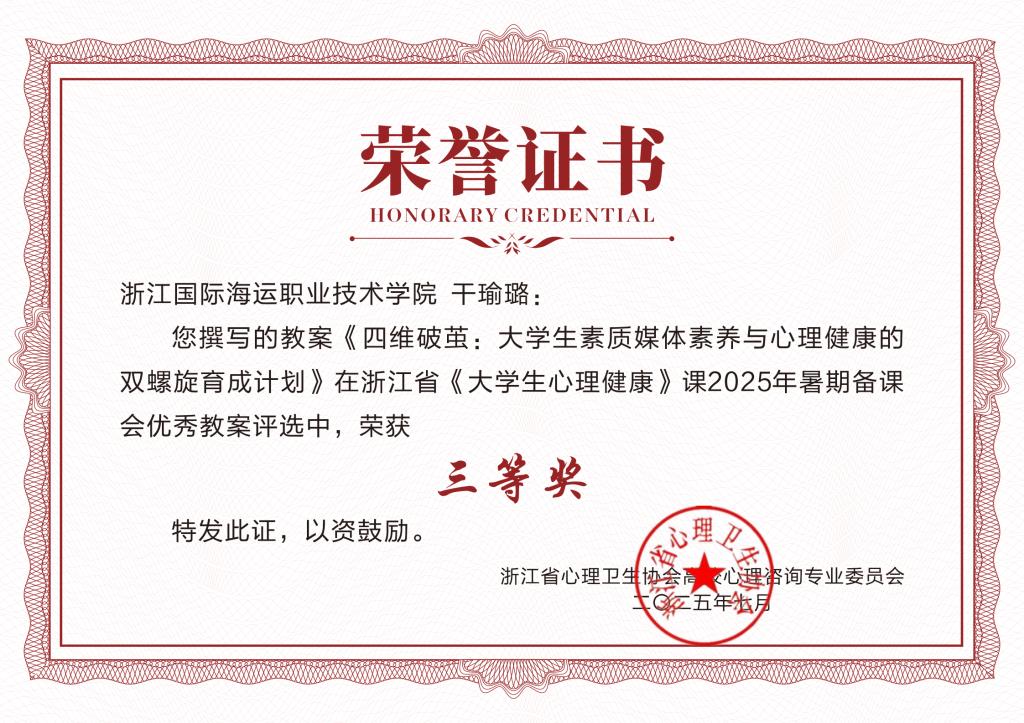 我校干瑜璐老师获省《大学生心理健康》课优秀教案三等奖