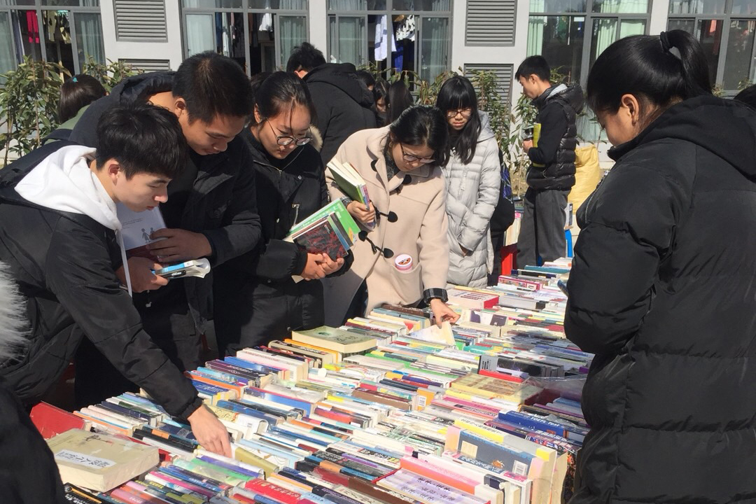 12月12日中午,我校图书馆与江苏书商在学生食堂商贸区联合举办图书展销活动。冬日的暖阳照着堆放整齐的推理小说、中外名著、人文经典等各类图书,吸引了大批师生驻足阅读、交流、购书,在学校掀起了一股浓厚的读书热潮。