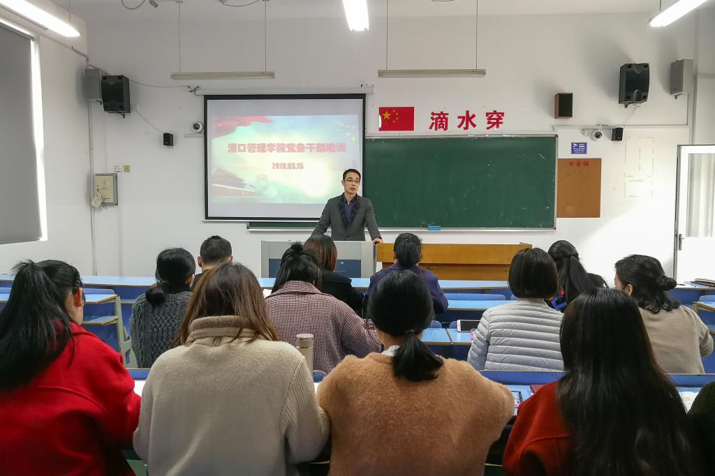 为切实提升新时代党务干部的政治、业务素质和实际工作能力,加强基层党建工作, 3月15日中午,港口管理学院党总支书记苏峰对学院19名党务干部进行工作培训。