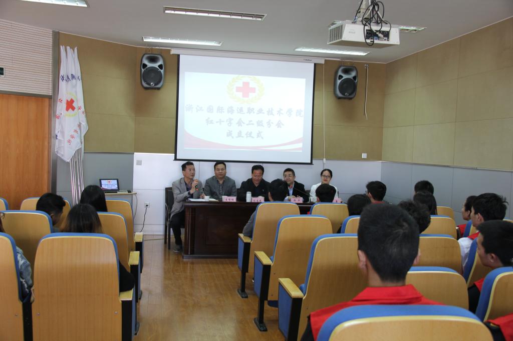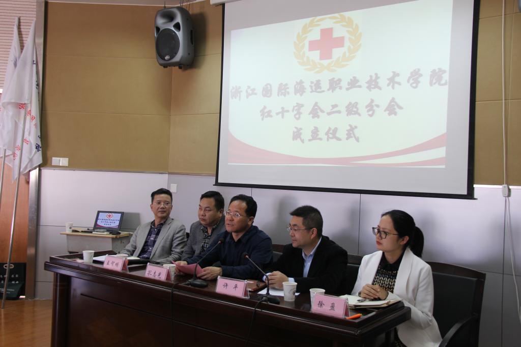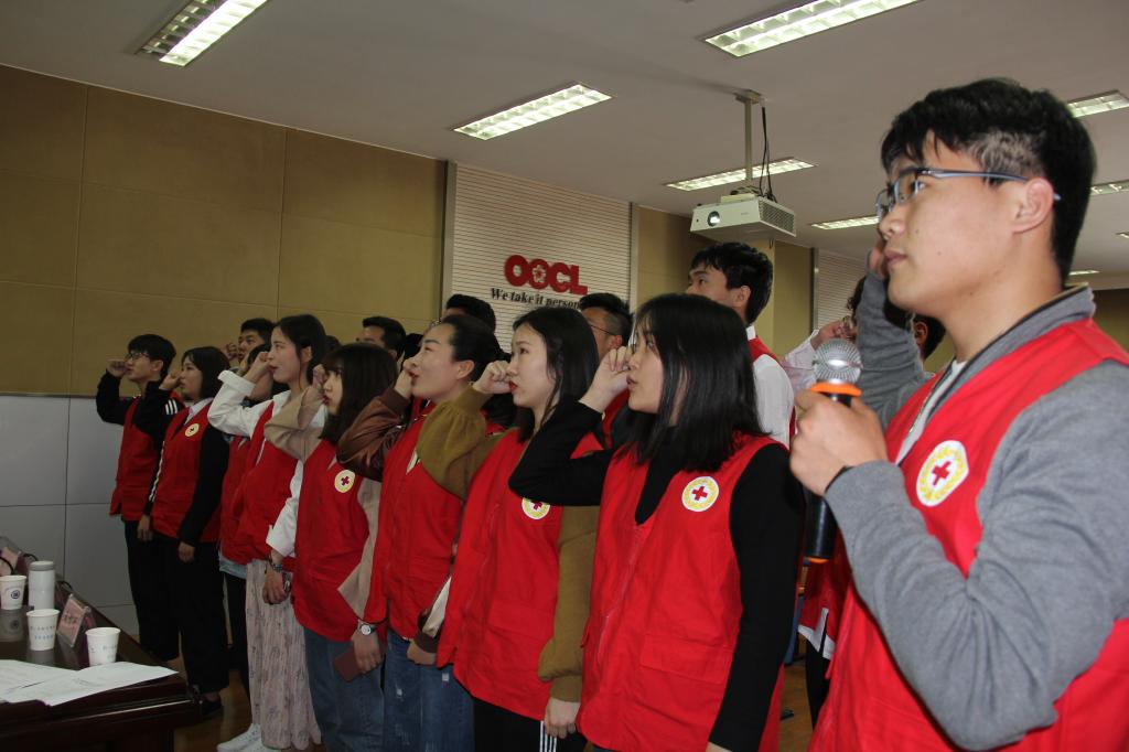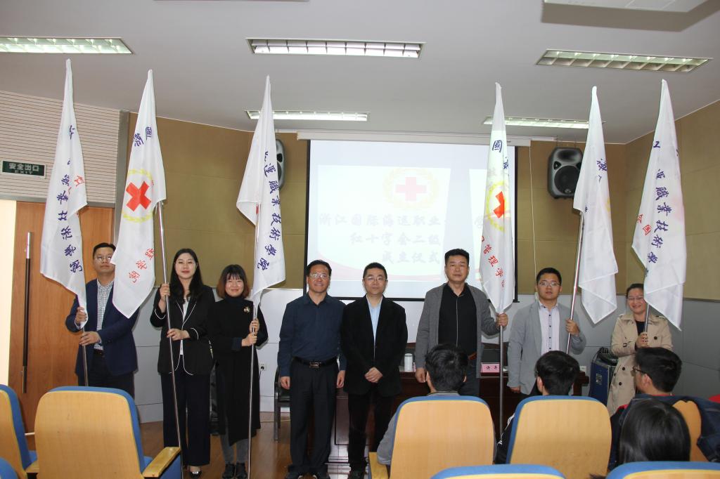 舟山市红十字会副会长许平、校红十字会会长孔志光副校长、相关部门负责人、各二级分会会长和秘书长及50余名学生代表参加成立仪式。会议主持人、后勤产业处处长蔡义雄首先宣读校红十字会二级分会成立通知文件,随着庄严的“我是红十字人”宣誓结束,许平、孔志光共同为6个分会授旗。