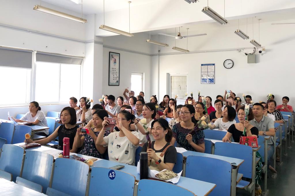 今年恰逢第34个教师节,团委学生会的干部们提前为老师们准备了康乃馨,他们在会议室门口为亲爱的老师递上黄色康乃馨,并亲切地道一声:“老师辛苦了,祝老师教师节快乐。”会议开始前,学生干部集体为老师们献上一首改编版的《小幸运》。老师们纷纷表示很惊喜,这是一次很幸福的教职工大会,为新学期的工作注满了力量。(图文/余娜娜)