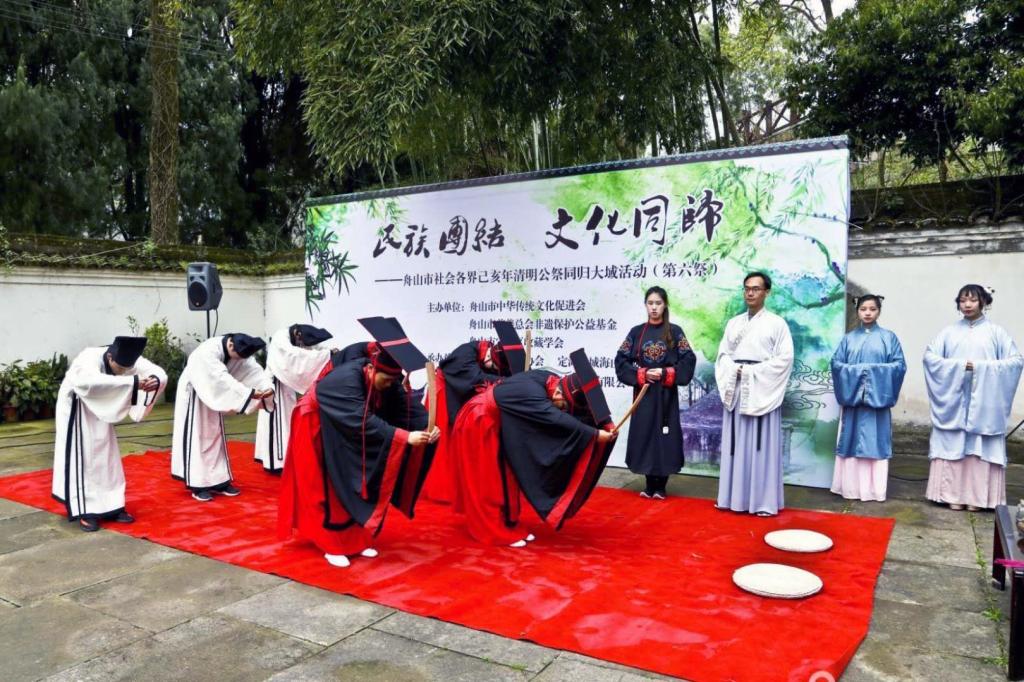 4月1日上午,海洋旅游学院爱心社与舟山市多个社会团体来到定海海山公园,参加由舟山市中华传统文化促进会、舟山市定海区收藏学会等单位主办的“民族团结 文化同归”清明公祭同归大域活动。