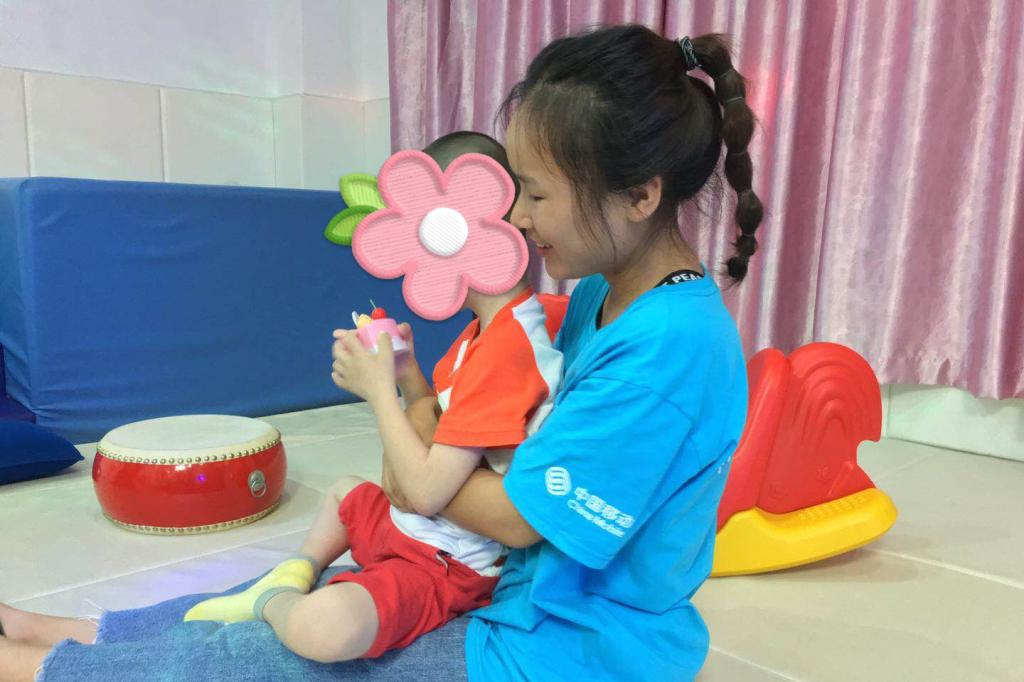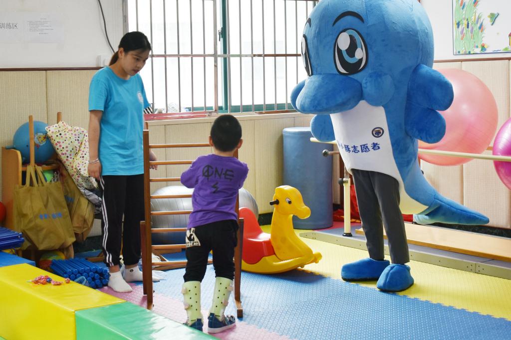 在工作人员的帮助下,志愿者们针对不同孩子特点,通过各种方式与孩子们进行交流,陪伴这些接受康复治疗的残障儿童。志愿者们准备了各种“教具”开设兴趣随心课堂、绘画思维教学,通过观察、学习和动手来锻炼孩子们的肢体协调能力。课堂上,志愿者与孩子们一起互动,在一片欢声笑语中,逐渐与孩子们打成一片。期间,海小豚的出现更是让孩子们兴奋不已,装扮成玩偶的志愿者早已大汗淋漓,他们用可爱的动作传递给孩子们一份纯真。