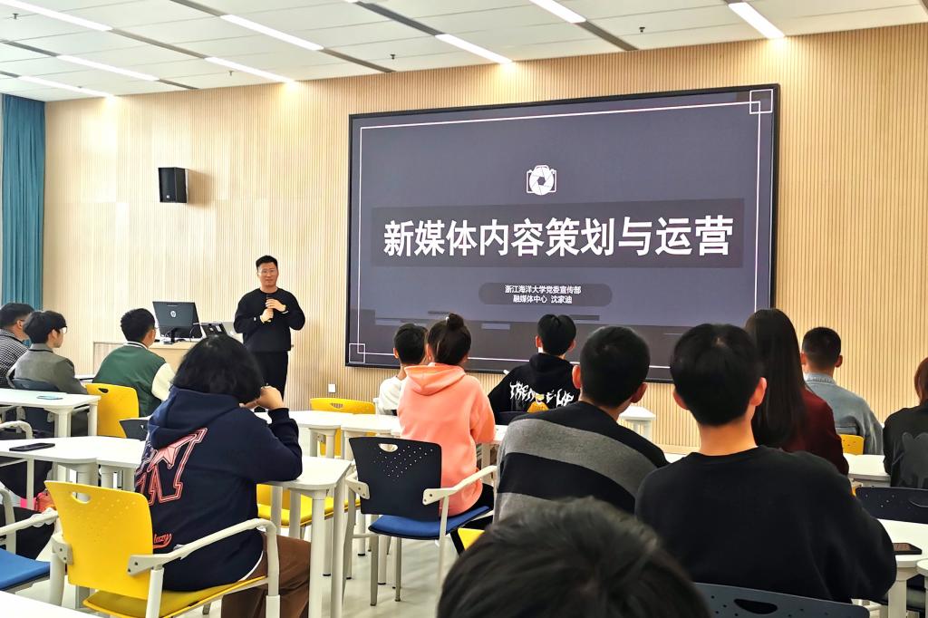 培训会上,围绕摄影技术、新媒体内容策划与运营、网络宣传阵地、摄像技术以及影像创作方面,分别邀请舟山日报社视觉新闻部记者张磊介绍了如何拍好校园和校园活动照;浙江海洋大学新闻中心沈家迪分享了新媒体运营所需的能力、素养和选题策划;舟山黑岛传媒有限公司总经理徐彬惠讲解了视频拍摄技巧;舟山电视台融媒体中心副主任蔡萍讲解了二十大报告中与新闻舆论工作相关内容以及如何守牢网络宣传阵地;浙江独丽帧影视传媒有限公司经理杨柯权分享了影像创作的底层逻辑。在后续课程中,培训班将组织学生赴浙江海洋大学现场学习和开展实践项目。