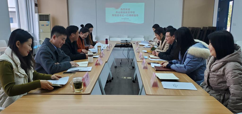 2月14日下午,舟山旅游商贸学校党总支书记陈恒波,副校长虞燕芬,教务处主任史佳琪、副主任魏君及旅游组专业教师一行6人来校,洽谈国际邮轮乘务管理专业中高职一体化合作。海洋旅游学院院长俞海平、副院长刘利娜和邮轮团队专业教师一同出席交流会议。
