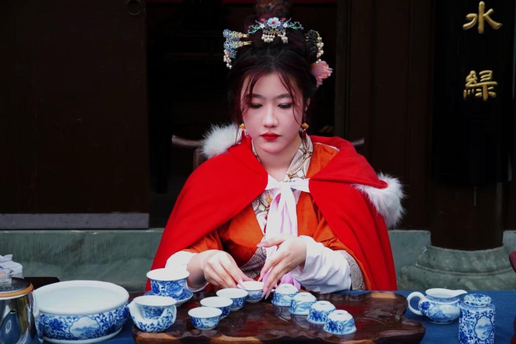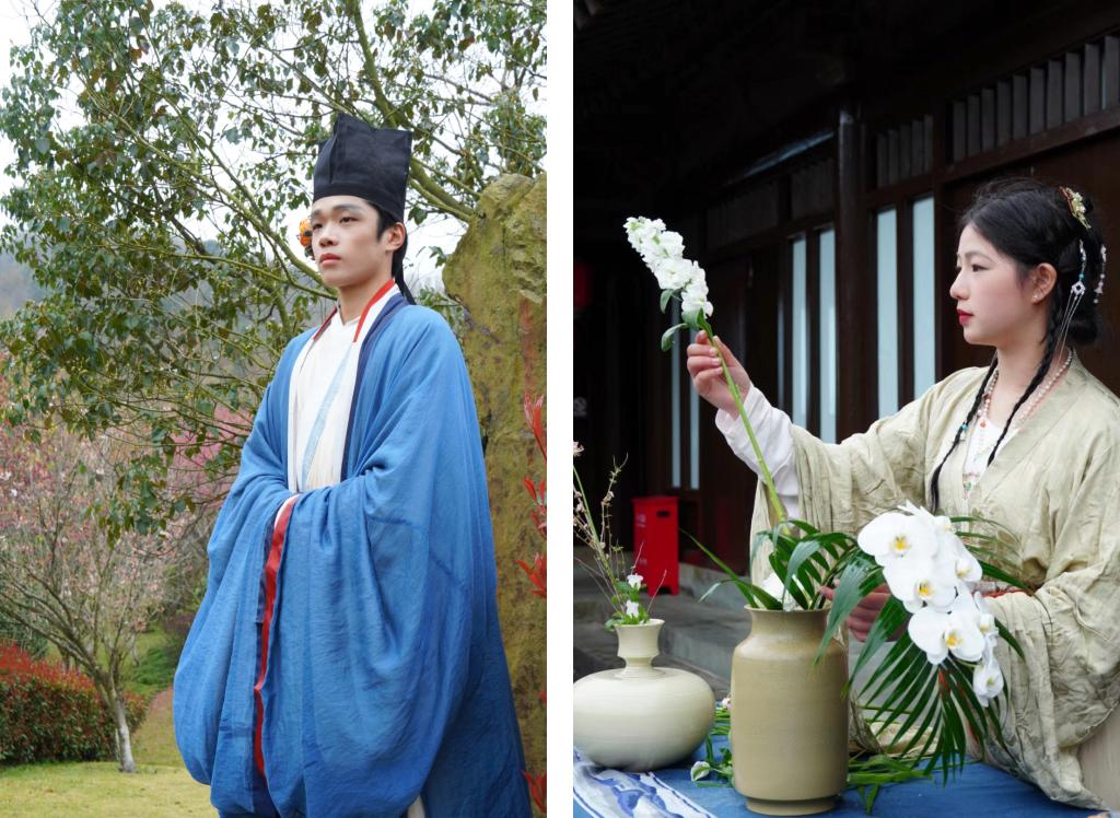 伴随着优美的古风乐曲,学院的学生志愿者们身着造型雅致的古风服装,或娴静端坐在茶桌前向观众展现茶道的魅力,或笑意盈盈用优美的身姿为游客表演花艺,或伫立一旁形象生动地复刻古人的身姿,给游客身临其境之感。
