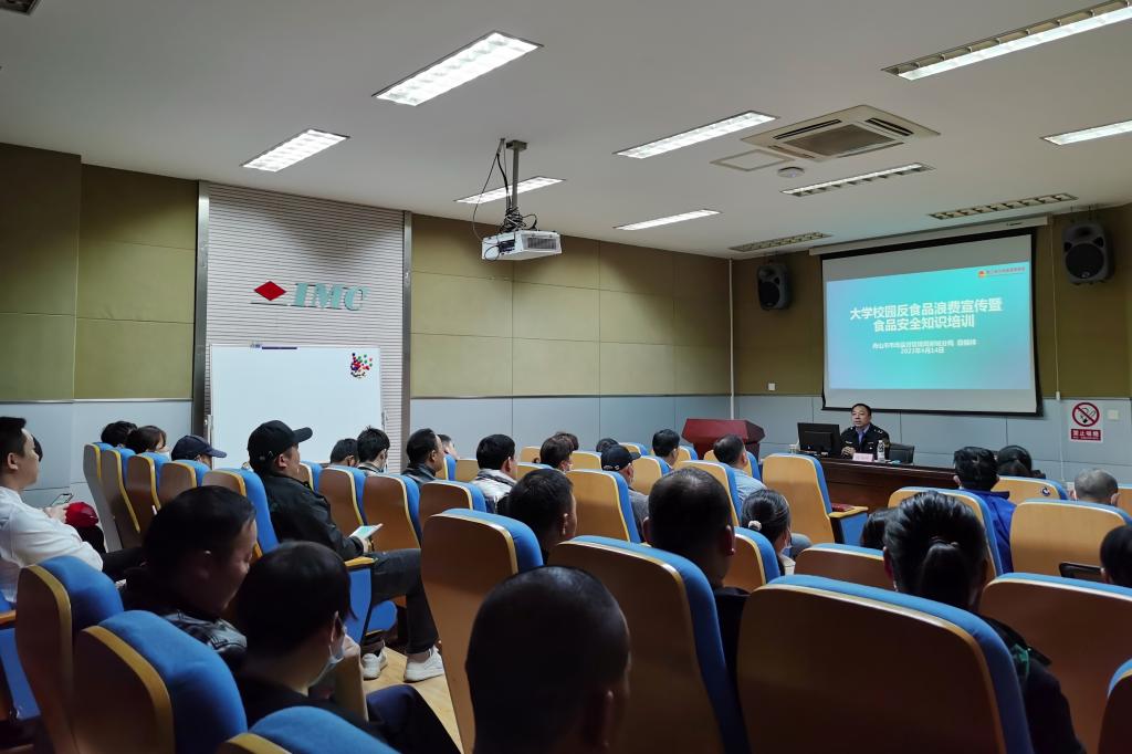 殷福祥科长结合日常检查中经常出现的问题,从抵制食品浪费、服务卫生规范、设施设备管理、原料贮运加工、从业人员健康等方面,进行了耐心详尽的讲解,针对性地提出了规范操作措施,并要求从源头上抵制食品浪费,守护好学校的食品安全之门。