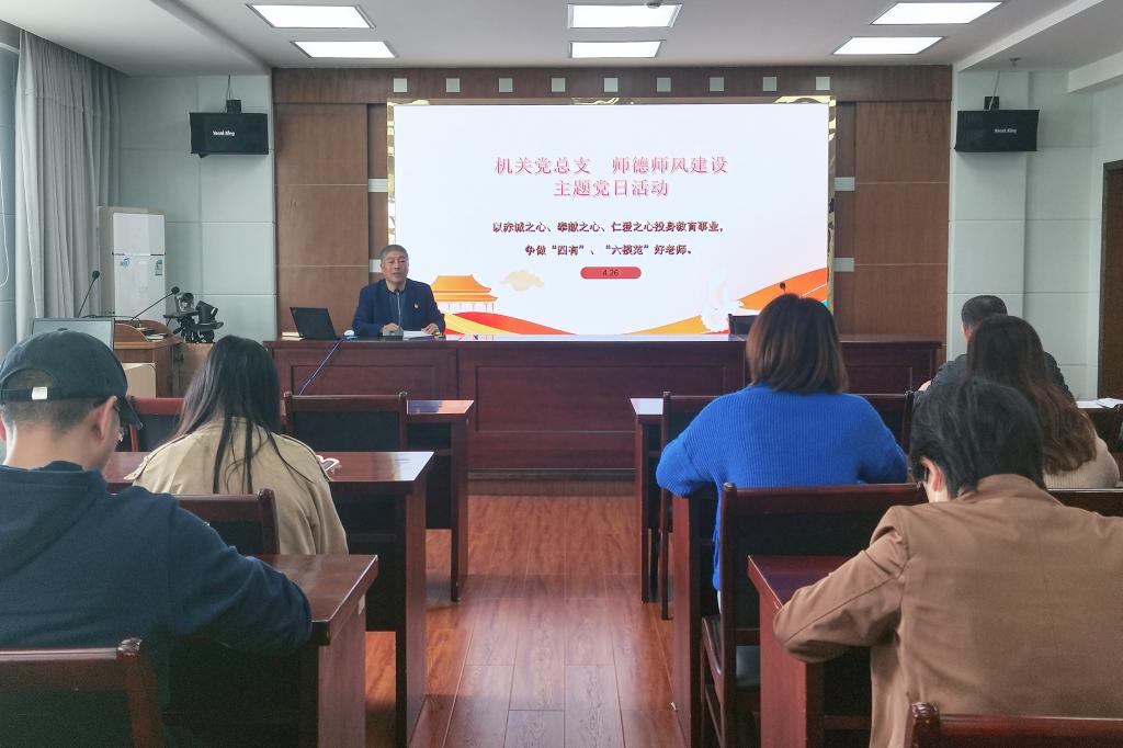 根据上级通知精神,按照学校《2023年师德师风建设年活动方案》和《师德师风问题整治工作实施方案》部署要求,4月26日,机关党总支在行政楼401会议室开展了师德师风建设主题党日活动,总支下属5个支部党员一起参加了学习会。