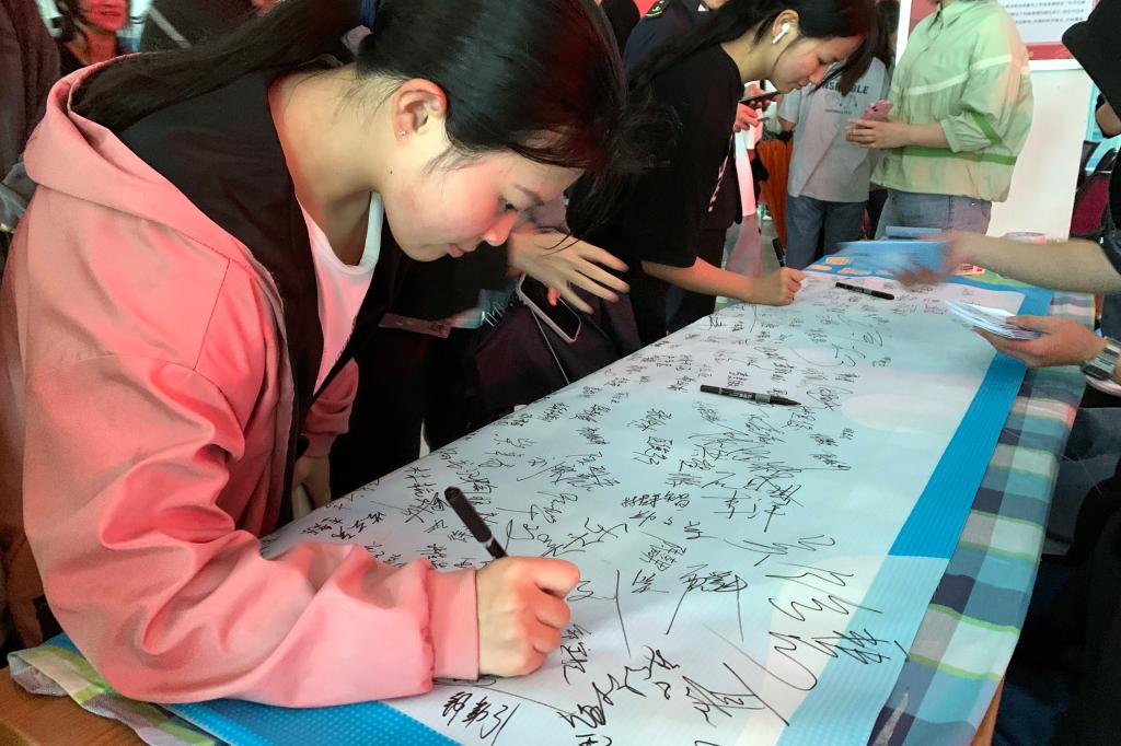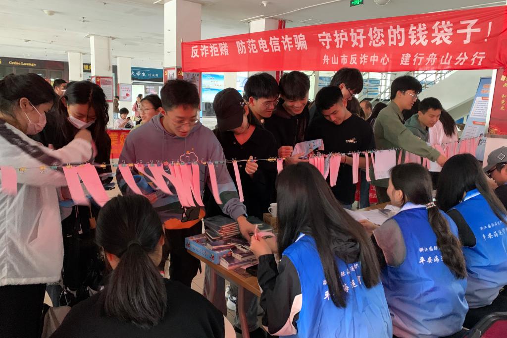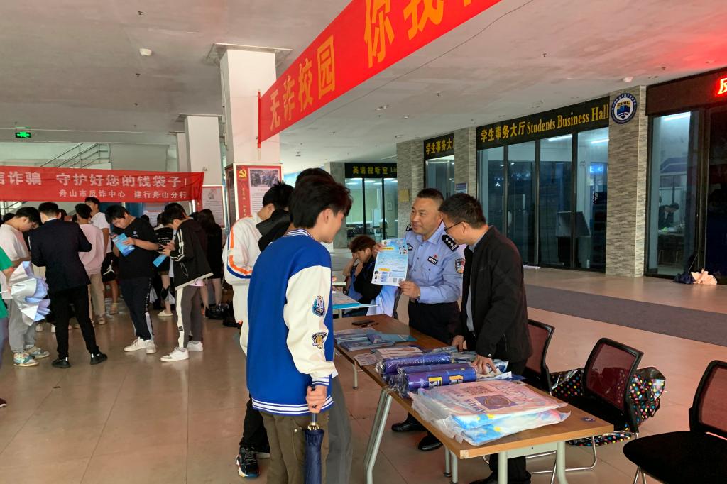 5月17日下午,学校联合舟山市公安局新城分局、新城管委会南海社区和建设银行舟山分行,在学校图书馆一楼大厅开展了“无诈校园,你我同行”签名和宣传教育活动。