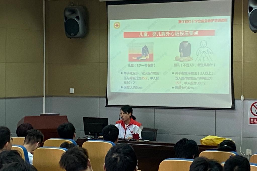 我校红十字会救护师周文群向大家介绍了红十字会的起源及心肺复苏与体外自动除颤仪(AED)应用相关知识与注意要点。随后,我校救护师金曙敏、董雪玲和舟山市红十字会应急救护中心副主任蒋朝进一起组织参训学员分四组进行实操训练,利用模拟人做到人人实操、人人过关。