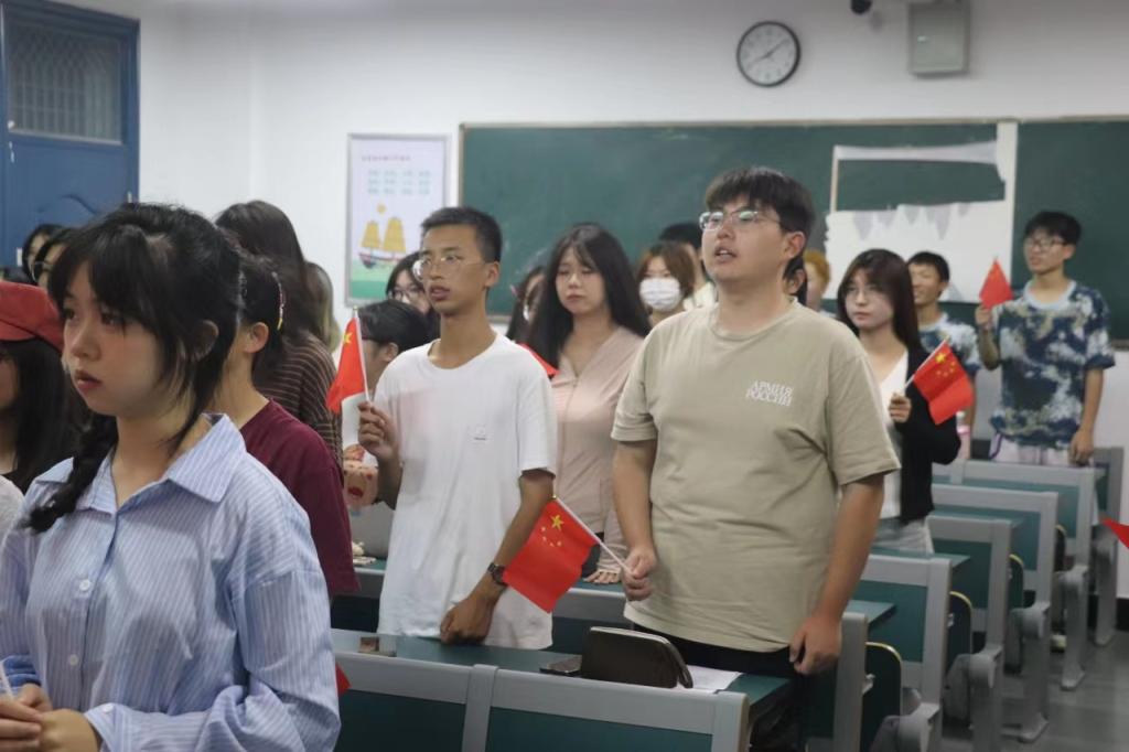 最美不过中国红,一条“红绸”环绕全场,随着《我爱你祖国》悠扬的歌声,五星红旗入场,与祖国大美山河同框。当国歌奏响的一瞬间,同学们集体站立,整齐划一地举起手中的国旗,齐唱国歌,用歌声表达着对祖国的深深热爱。
