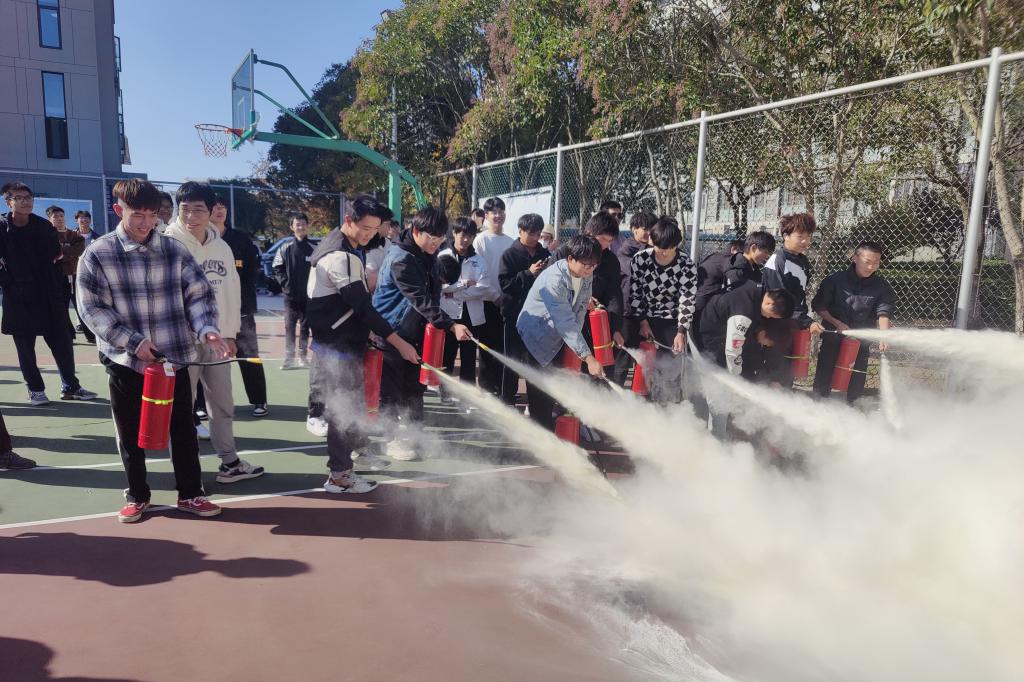 演练开始后,模拟三号寝室楼发生火灾,寝室楼内立即启动应急疏散程序。在辅导员的疏导下,学生们迅速有序地按照预先规划的疏散路线进行撤离,整个疏散过程只用了不到10分钟,所有人员都安全地撤离到了指定的集合地点。在集合点,消防人员详细讲解灭火器的使用方法,并指导所有寝室长操作使用灭火器。各寝室长亲身体验灭火器的“提、拔、瞄、压”四字操作规程,熟悉和了解灭火器的使用方法。