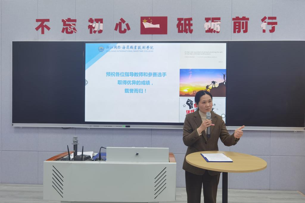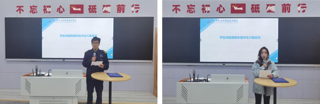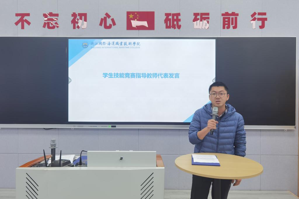 随后,海洋装备工程学院“船舶主机和轴系安装调试赛项”指导老师颜金龙、航海工程学院“中国海员技能大比武”竞赛学生胡增鹏、现代港口贸易学院“市场营销”赛项学生傅灵艺分别作了交流发言,他们分别分享了指导学生参加学生技能竞赛、参加学生技能大赛中的经历、感悟和收获。他们表示,将刻苦训练、奋勇拼搏,力争在今年的大赛上取得佳绩,为学校高质量发展贡献自己的力量。