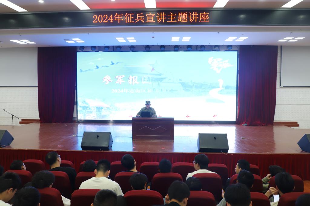 为推进我校2024年大学生应征入伍工作,5月15日下午,学校在图书馆四楼报告厅举办了2024年征兵宣讲专题讲座。宣讲会由舟山市定海区人武部孙舟琦主讲,全校共有四百多位同学参加。