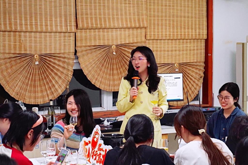 “海上侍酒师俱乐部”社团指导教师孔洁策划组织了学院的40名师生共同参与此次课程。现场,师生们一一品鉴了6款来自京津冀产区的白葡萄酒和桃红葡萄酒,并对葡萄酒品鉴知识和酒款特色进行了介绍。本次品鉴的酒款有的咸鲜味明显,有的花香果香奔放,有的带有独特的龙眼香和玫瑰花香。来自社团的5名侍酒师学生在孔洁老师的指导下全程做好侍酒服务工作,参与活动的学生表示这样的“第二课堂”很不一样,希望以后能推出更多类似的活动。