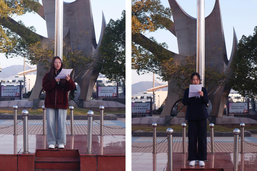 在庄严的国歌声中,全体师生肃立,面向国旗致敬。升旗结束后,来自2024级数字媒体艺术设计1班的苏娜同学发表了题为《健康是青春的基石与航标》的演讲,她呼吁同学们要重视自己的身心健康,多运动少玩手机,并进行了防艾宣传,呼吁多了解和学习防艾知识,珍惜青春时光。随后,为迎接即将到来的12月4日第十一个国家宪法日,弘扬宪法精神,学生会干部、2023级现代物流管理1班的俞佳汝同学带领全体学生进行了宪法晨读活动,共同学习宪法的重要条款。