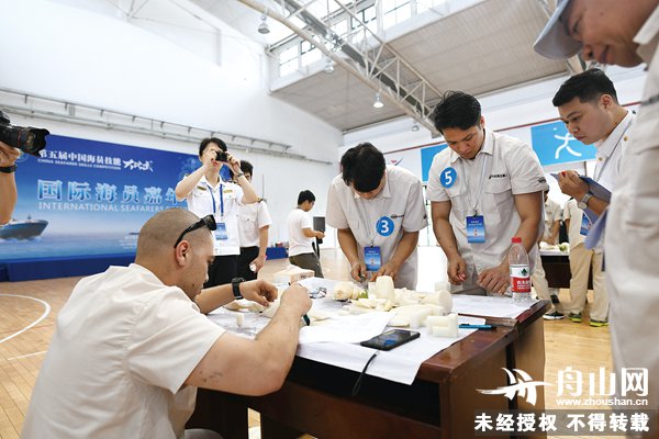 一旁的“盲人摸象”打绳结比赛同样趣味纷呈。外籍船员戴上眼罩后,将双手伸进纸箱内摸绳结。如果觉得摸到的绳结可以完成,就将绳结交给裁判,并根据记忆蒙眼完成绳结的编制。八字结、单套结、双套结……外籍船员打出了一个个甲板上常用的绳结。每准确完成一个绳结,一旁的队员都会欢呼鼓掌为同伴喝彩。