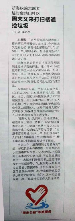 《舟山晚报》:浙海职院志愿者结对金鸡山社区 周末又来打扫楼道捡垃圾