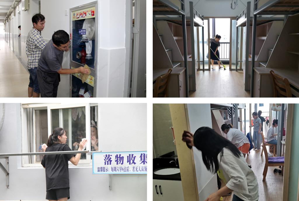 学校以宿舍楼层为单位划分责任区,将具体任务分解到人。师生们分工明确,各司其职,对寝室的门窗、墙面、地面、阳台、卫生间等进行了彻底清洁,对风扇、灯具、家具等进行了仔细检修。虽然天气闷热,也没有阻挡师生打扫的热情。经过大家的努力,寝室环境焕然一新。