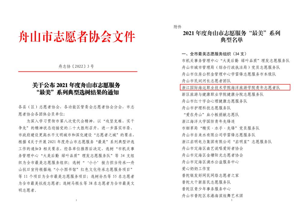 近日,2021年度舟山市志愿服务“最美”系列典型选树结果揭晓,我校海洋旅游学院青年志愿者队荣获“全市最美志愿服务组织”、陈尔栋老师荣获“全市最美抗疫志愿者”、学子陈宏荣获“全市最美文明志愿者”。