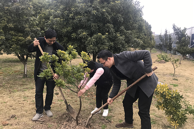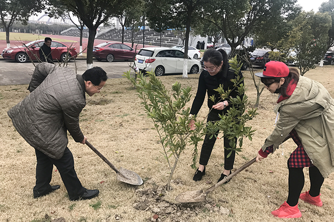 在学校游泳池西侧杨梅林,大家冒着绵绵细雨,拿起各种工具埋头植树。大家互相配合,有的挥锹铲土、有的扶树填土、有的培土浇水,忙得不亦乐乎。经过大家的劳动,几十棵杨梅树在绿化带里 “安家落户”,为校园添上了一片新绿。